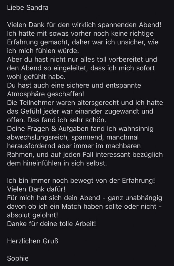 Melde dich auch gerne, auch wenn du nicht exakt ins Alterspektrum passt, ein bisschen drüber oder drunter ist total ok. Bist du interessiert, aber es würde ein anderes Alterspektrum oder ein homosexuell orientiertes Event besser zu dir passen? Lass es mich wissen! Bei hoher Nachfrage werde ich neue Events anbieten.