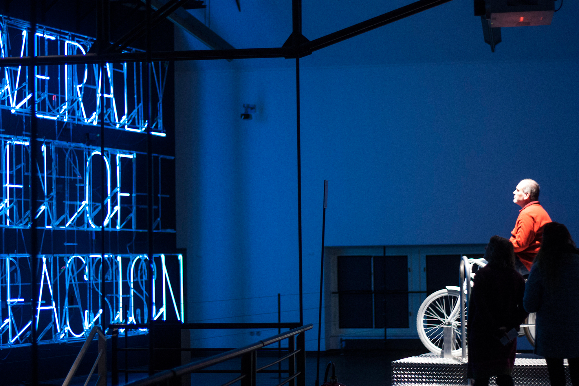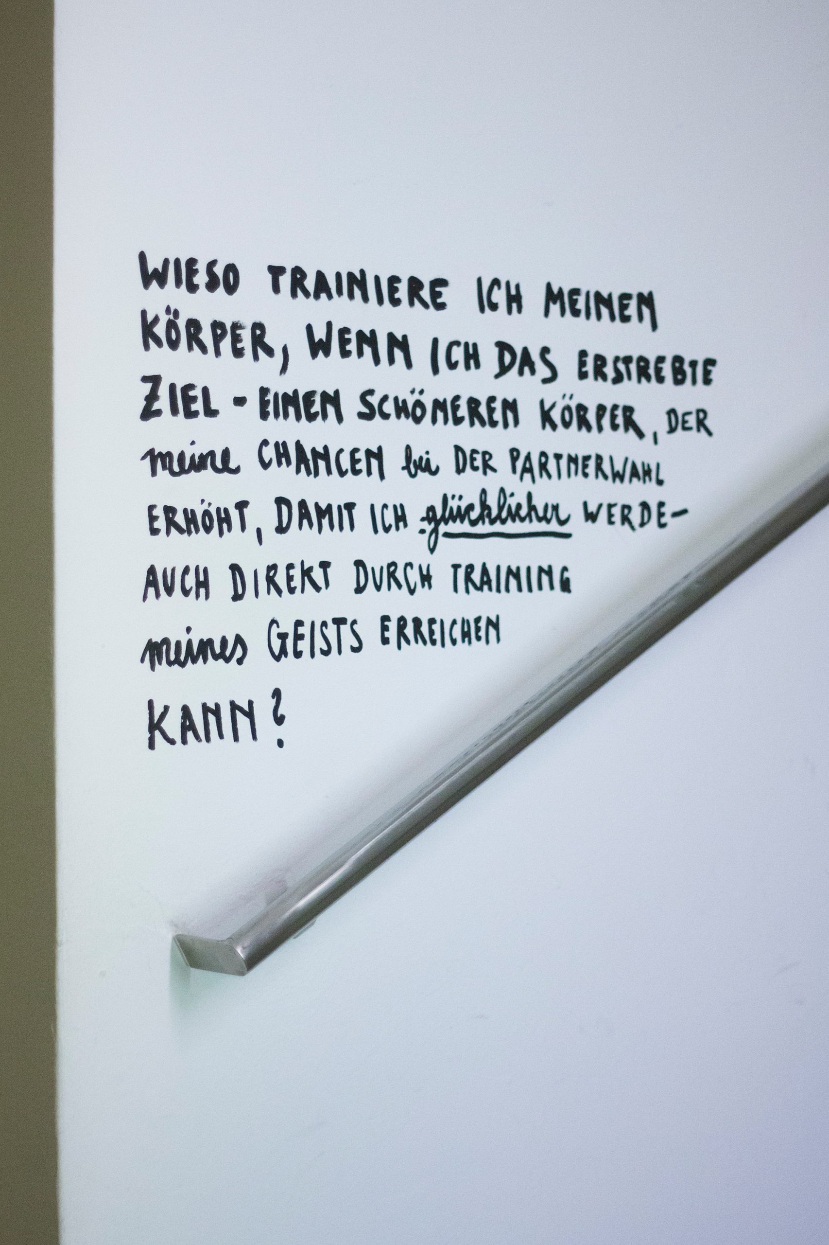 Immer wieder lädt er den Besucher ein Teil der Ausstellung zu werden. Man darf etwas zeichnen, sich eine Süßigkeit nehmen oder mit einer Installation interagieren. Zum Beispiel konnte man ein digitales Spinnennetz das auf eine Wand projeziert war mit den eigenen Händen verzerren oder zerreißen. Sagmeister beleuchtet mit seinen Werken verschiedenen Bereiche des menschlichen Lebens wie: Mentale Gesundheit, Liebe oder Geld. Mithilfe von Bild, Ton, Video und Text zeigt er worauf es im Leben wirklich ankommt. Wenn du mit wachen Augen durch die Räume gehst entdeckst du immer wieder kleine Anekdoten, auf den Wänden, im Aufzug und sogar in den Toiletten!